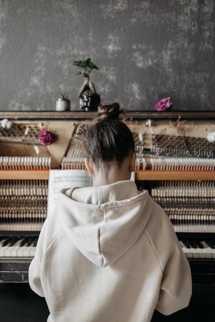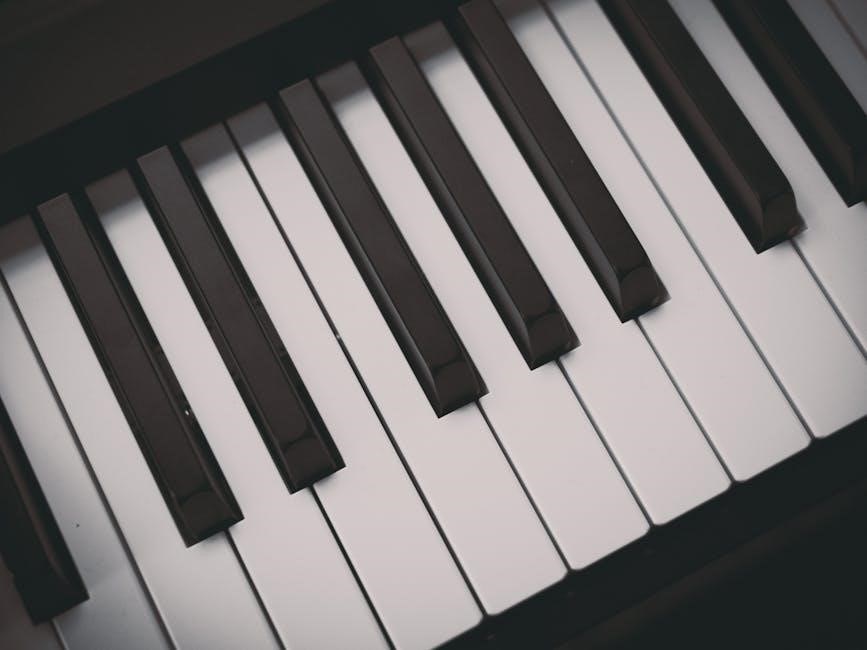 Fingers should be rounded and strike the keys with the pads, not the tips. PDF guides often include diagrams illustrating correct hand placement. Posture is equally vital; sit upright on the bench, maintaining a comfortable distance from the piano.